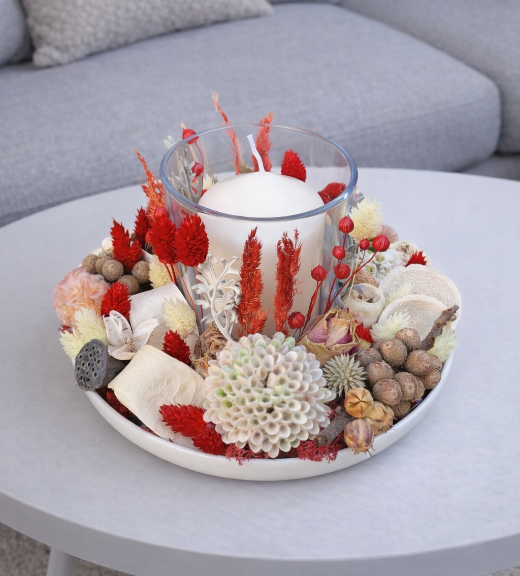 Výrazný prírodný aranžmán so sviečkou je navrhnutý ako dominantný dizajnový prvok do moderného interiéru. Centrálna biela sviečka v sklenenom valci je obklopená kompozíciou sušených a stabilizovaných kvetov v kombinácii červenej, krémovej a prírodných hnedých tónov.