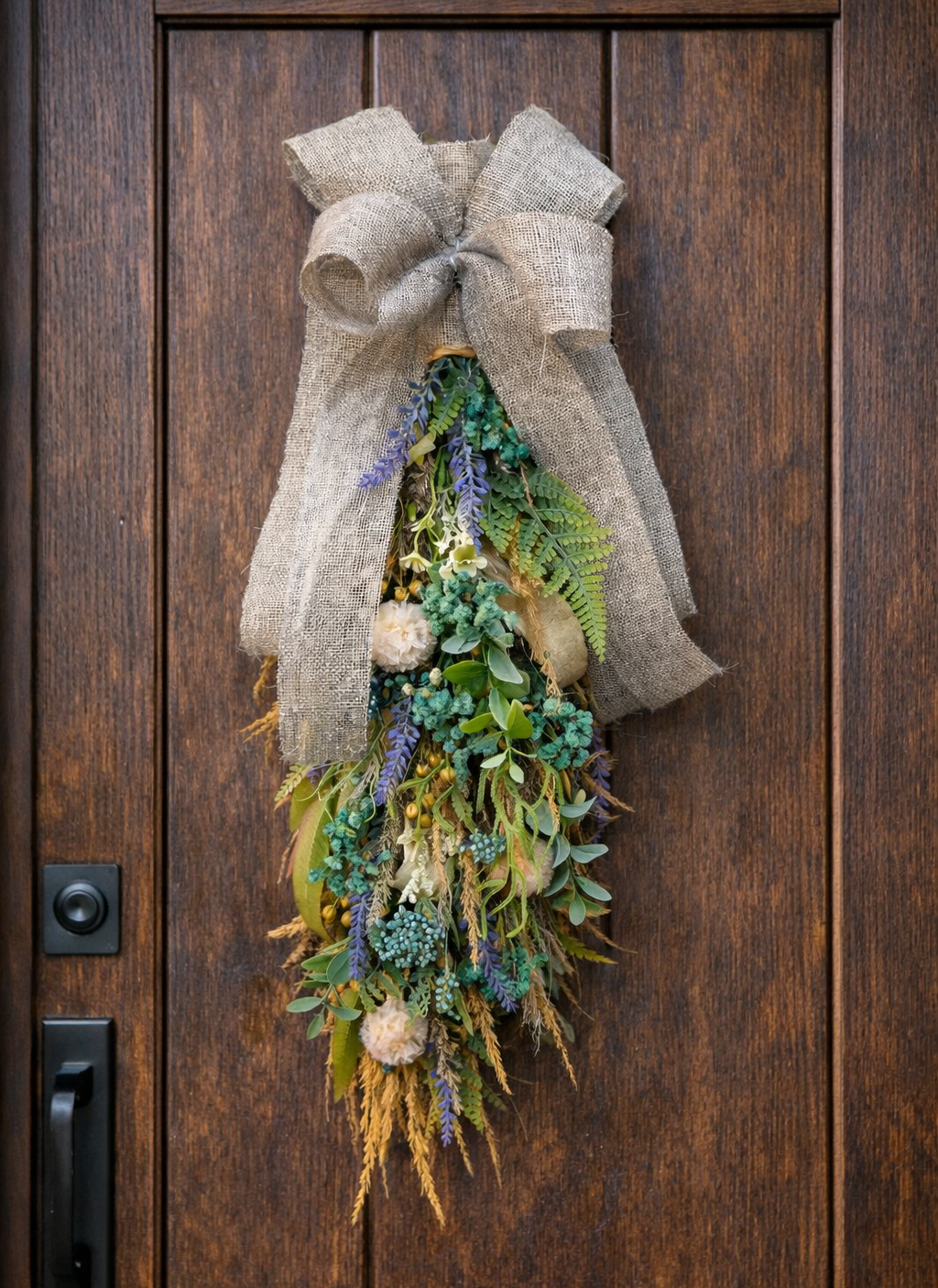 Ručne vyrábaná dekorácia na dvere z prírodných prvkov, doplnená o jemné kvety, zeleň a výraznú jutovú mašľu. Kombinácia zelených listov, sušených tráv a prírodných materiálov vytvára elegantnú dekoráciu vhodnú na vchodové dvere počas jari aj celého roka.